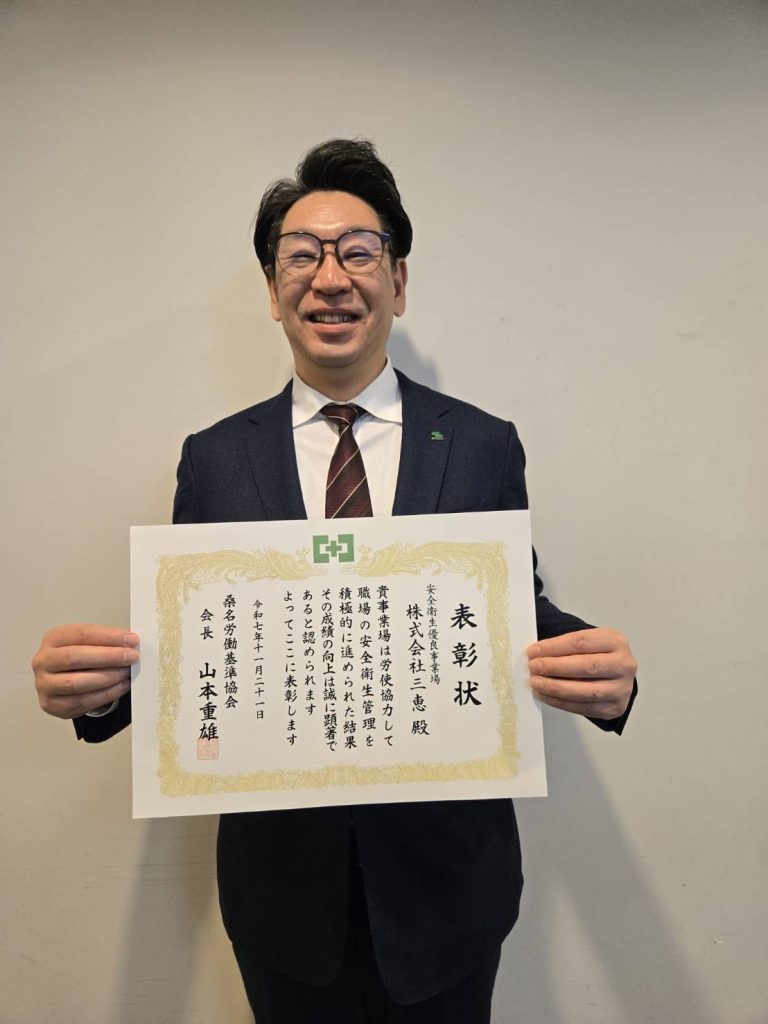 2025年11月25日 By 株式会社三恵 2025年11月21日 桑名労働基準協会様により開催された「桑員地区産業衛生大会」で株式会社三恵は「安全衛生優良事業場」として表彰していただきました。 休業や入院が必要となる様な大きな事故やケガが発生していない事が評価されました。 これは日頃から安全を意識して業務に取り組まれている従業員、安全な職場づくりに取り組んでいただいている安全衛生委員の皆様の努力の賜物です。 これからも一丸となって事故やケガの無い職場づくりに取り組んでまいりましょう。